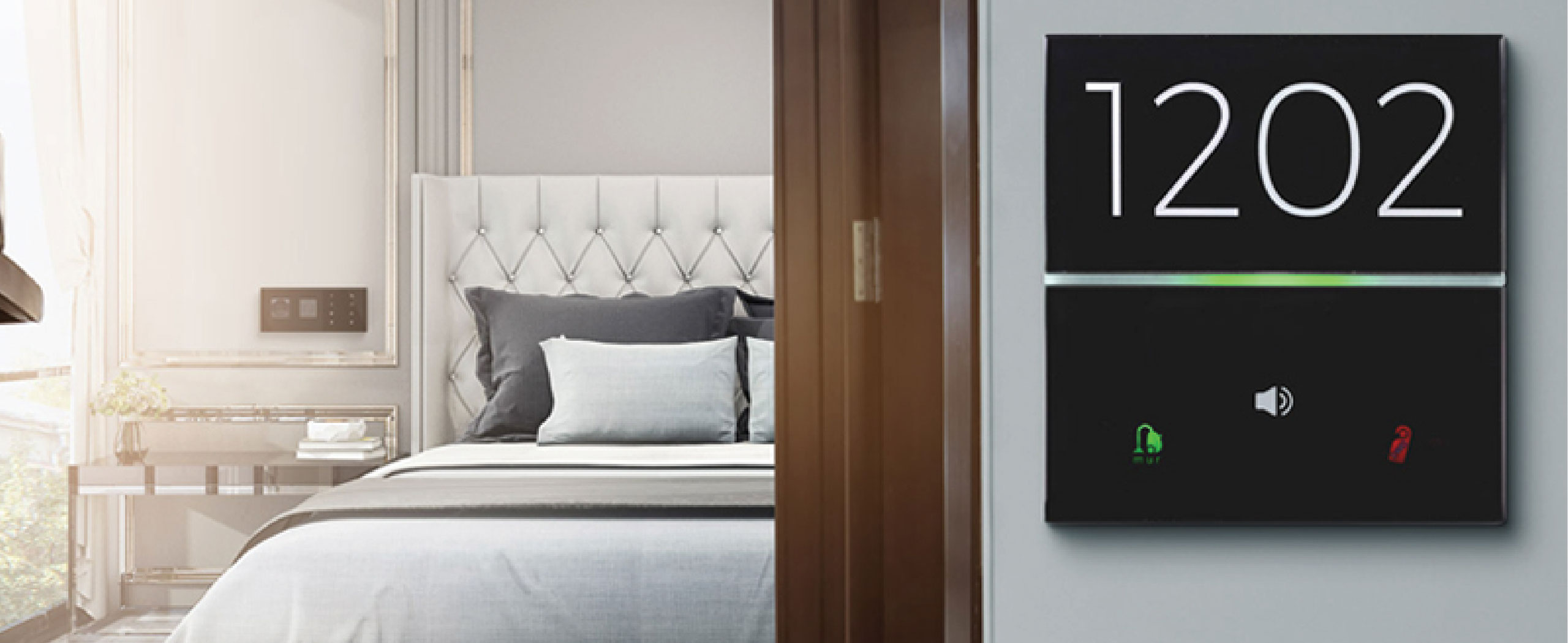Le client sélectionne une option sur le tableau de commande DND situé dans la chambre, par exemple “prière de ne pas déranger” ou “merci de nettoyer” et cela apparaît immédiatement sur le tableau DND situé dans le couloir.